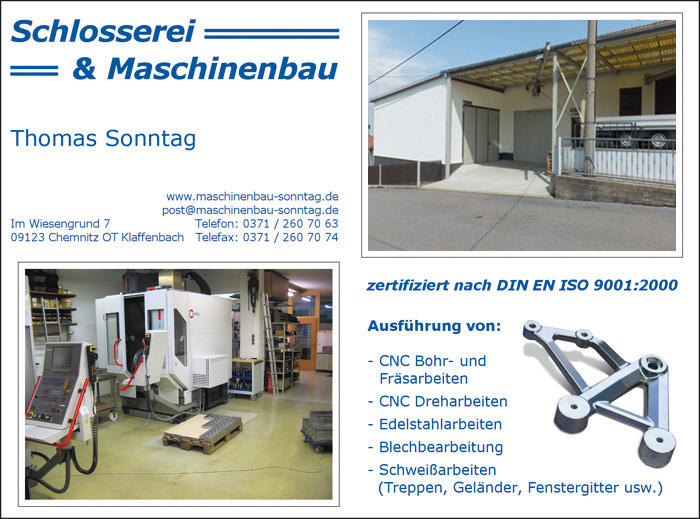 Liebe Gäste und Besucher, die Firma Schlosserei & Maschinenbau Thomas Sonntag, Im Wiesengrund 7 in 09123 Chemnitz OT Klaffenbach, ist ein kleiner Familiengeführter Handwerksbetrieb. Wir sind Zulieferer für namhafte Firmen in den verschiedensten Bereichen, fertigen aber auch Ersatzteile an und sind auch für Privatkundschaft der richte Ansprechpartner. Unter der Rubrik "Fertigung" erfahren Sie mehr über unsere betrieblichen Möglichkeiten und die Bilder unter der Rubrik "Erzeugnisse" geben einen kleinen Einblick in bereits ausgeführte Arbeiten. Folgende Arbeiten führen wir aus: